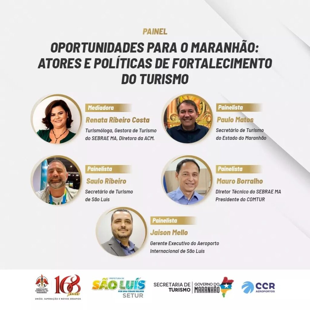 Mediado pela VP para Assuntos do Turismo e especialista na área, Renata Costa, o painel terá como convidados os secretários da Setur SLZ e Setur MA, Saulo Ribeiro e Paulo Mattos, respectivamente; o diretor Técnico do Sebrae-MA e presidente do COMTUR São Luís, Mauro Borralho e, ainda, de Jaison Mello, gerente executivo do Aeroporto Internacional de São Luís – CCR Aeroportos.